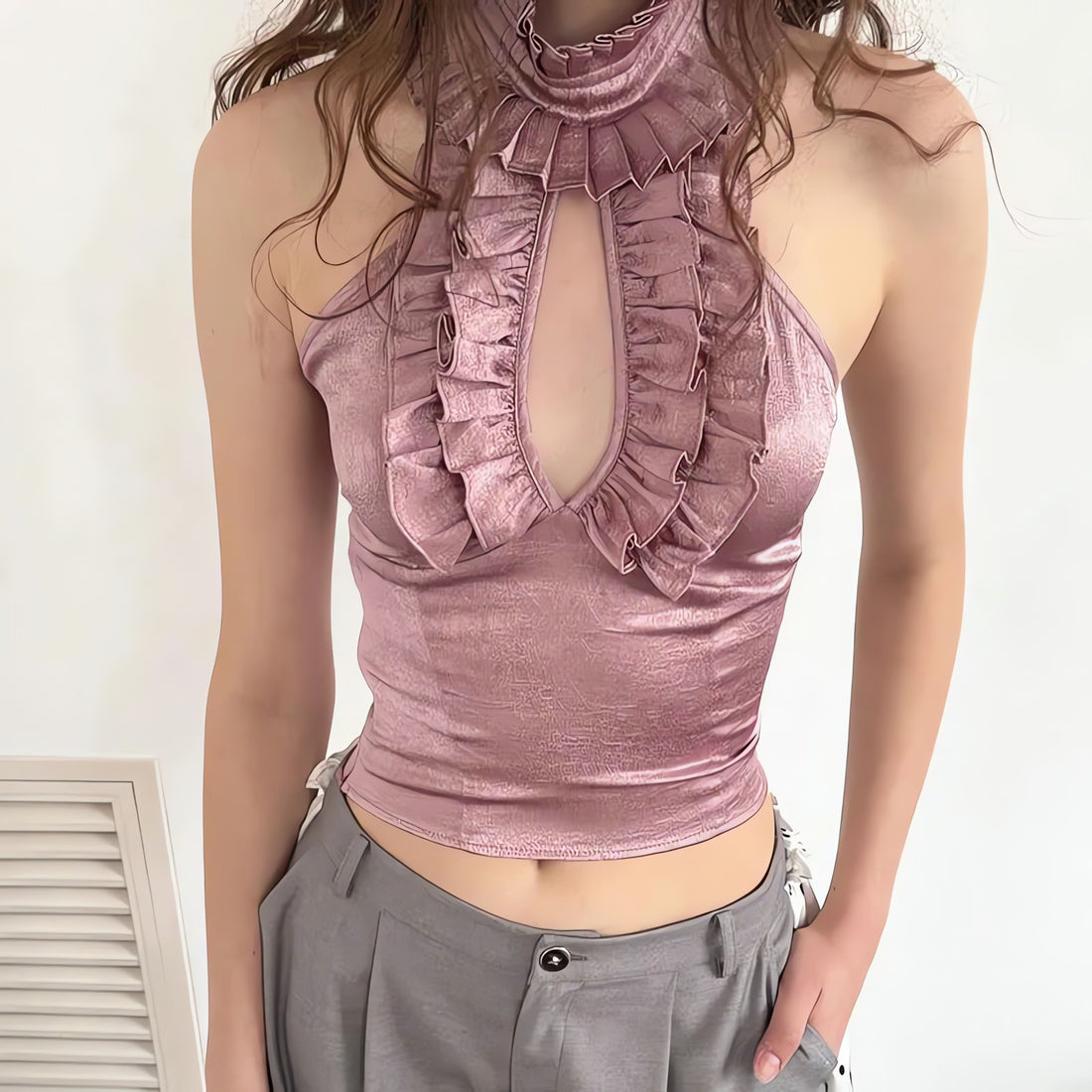 Cut Out Ruffled Halter Neck Top
