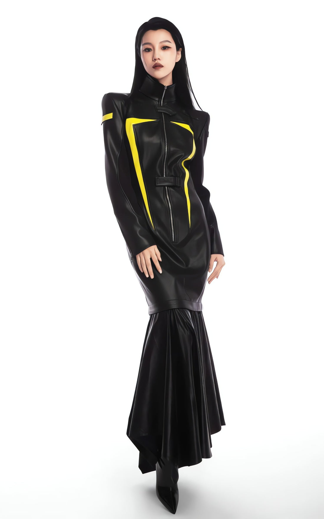 Step into the future with our Cyberpunk Faux Leather Maxi Dress! This sleek, form-fitting garment...