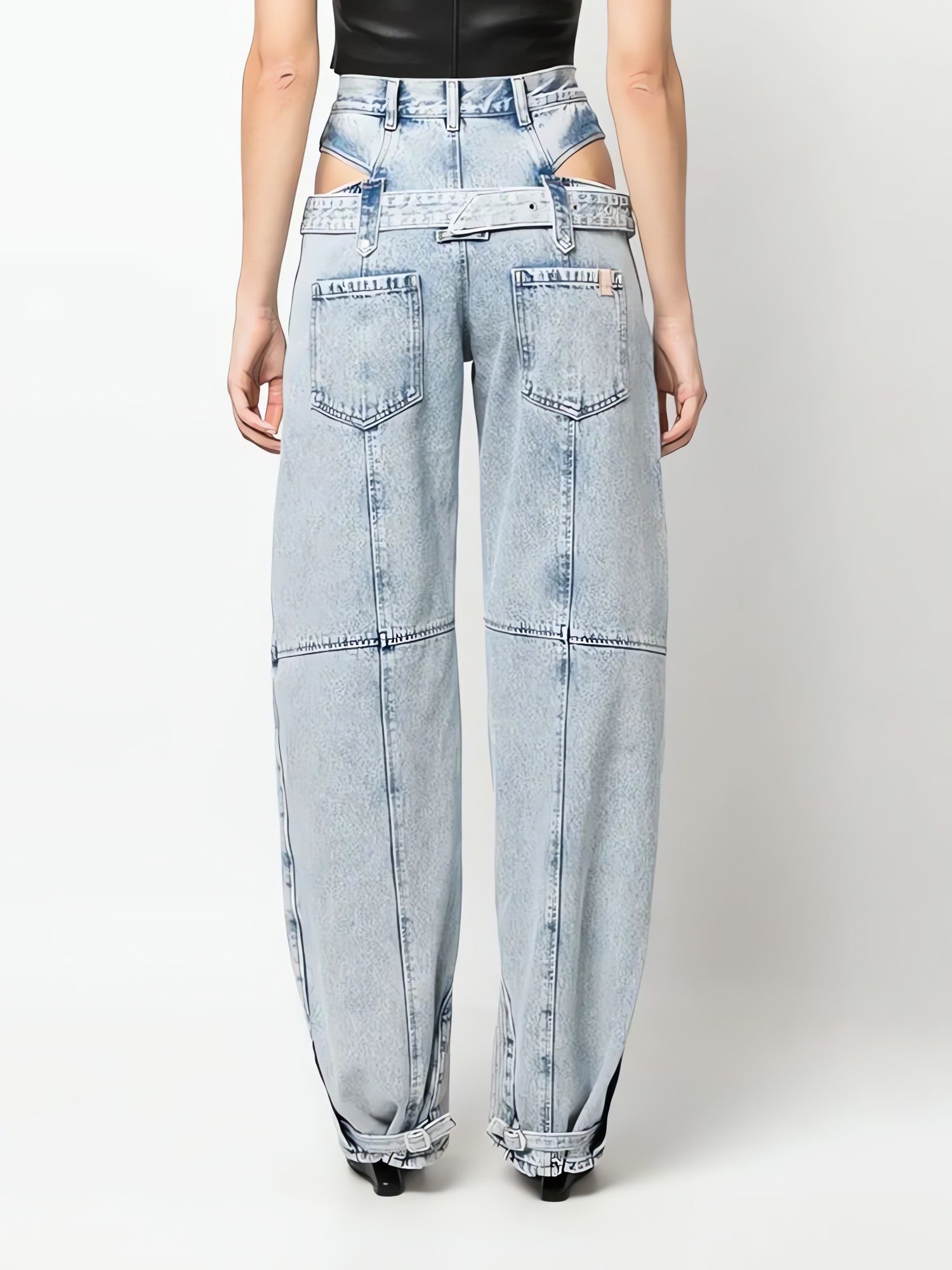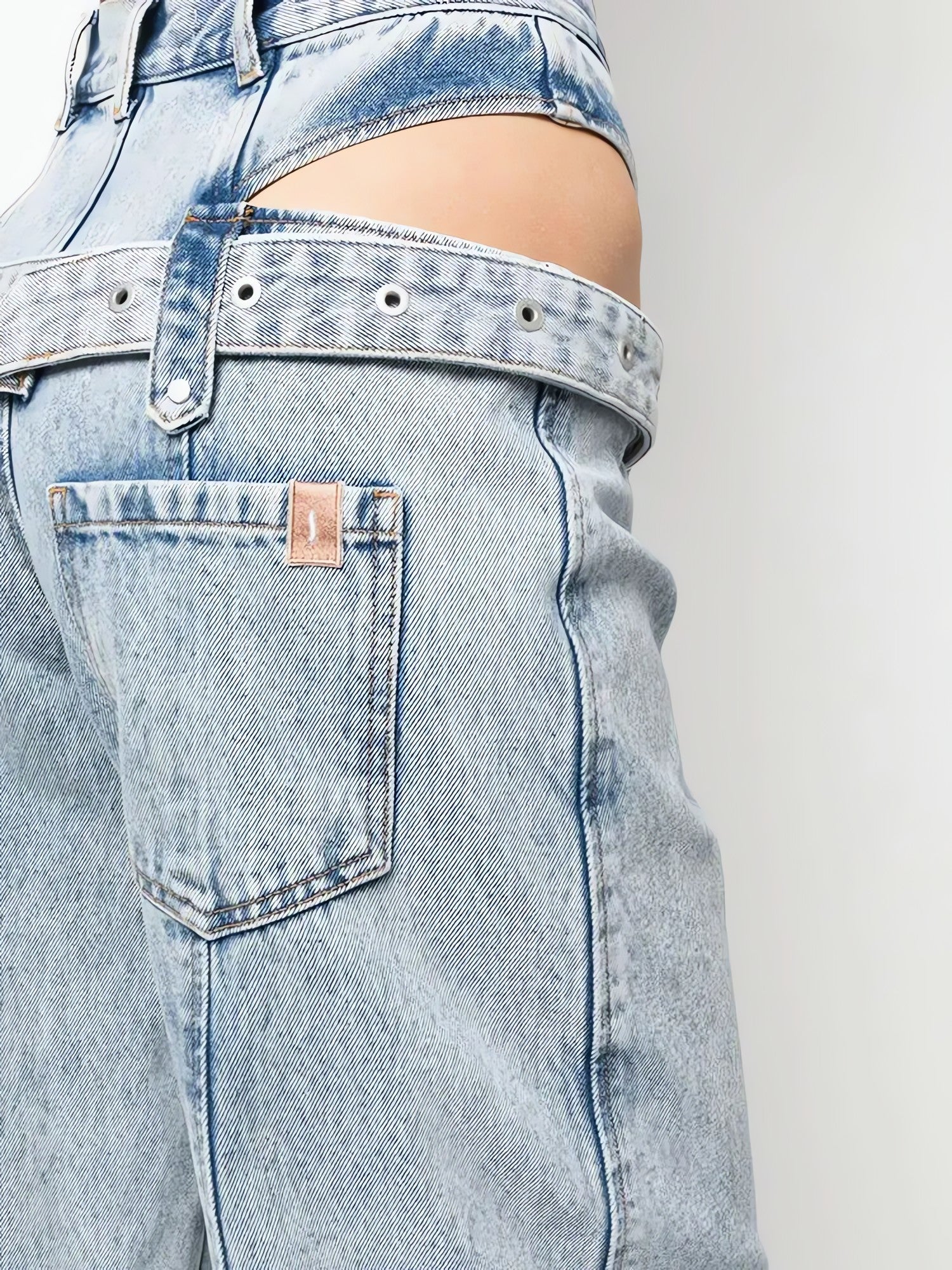 Introducing the Y2K Belted Cut Out Jeans: a bold statement piece that embodies the iconic fashion trend of the 90s.