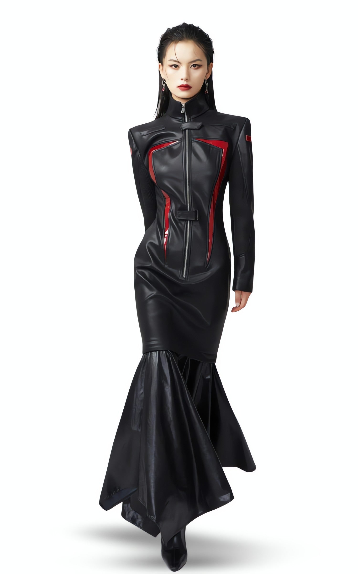 Step into the future with our Cyberpunk Faux Leather Maxi Dress! This sleek, form-fitting garment exudes a chic and modern aesthetic that's perfect for any fashion-forward individual.