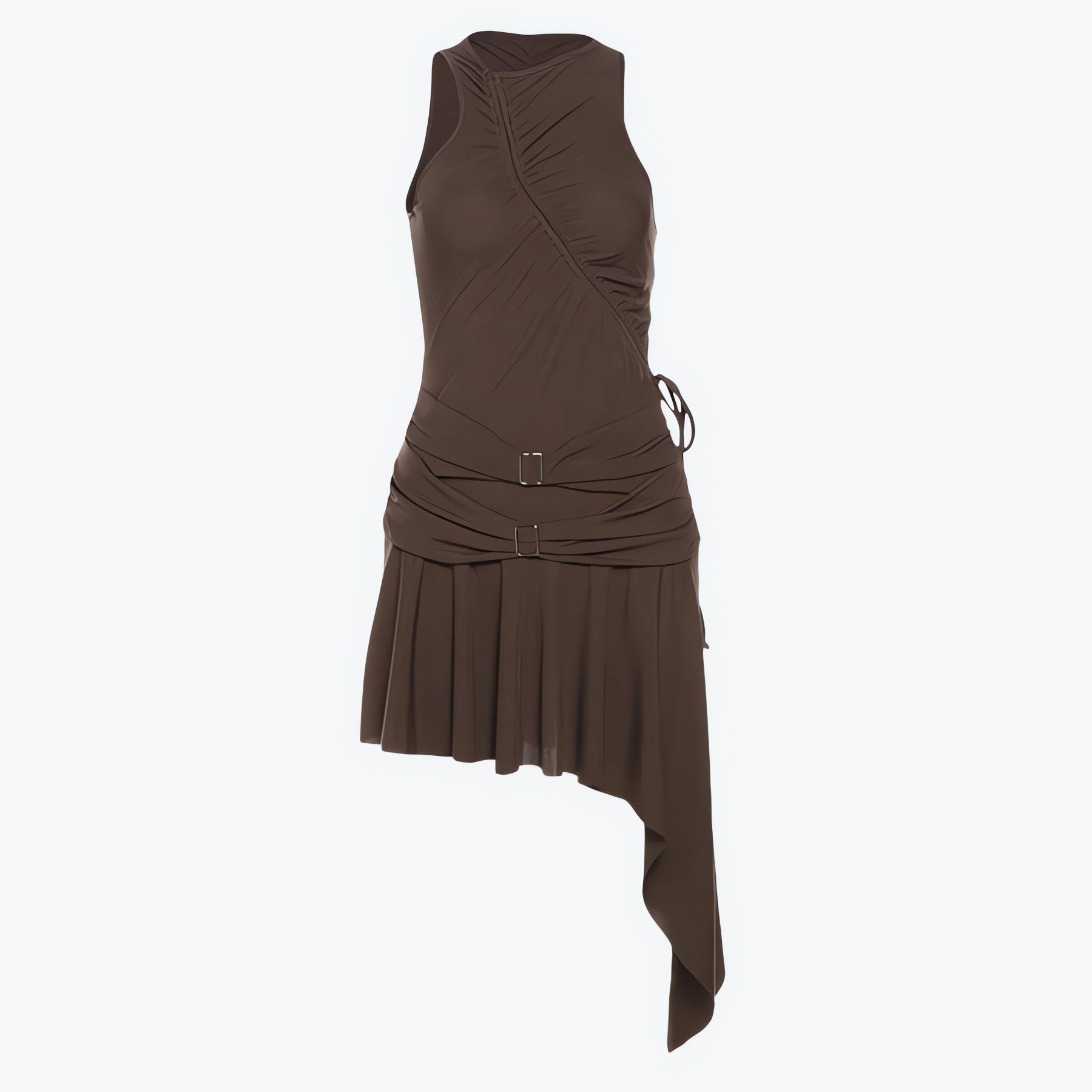 Step into the future with our Cyberpunk Ruched Asymmetric Mini Dress, a statement piece that combines timeless style with modern urban fashion.