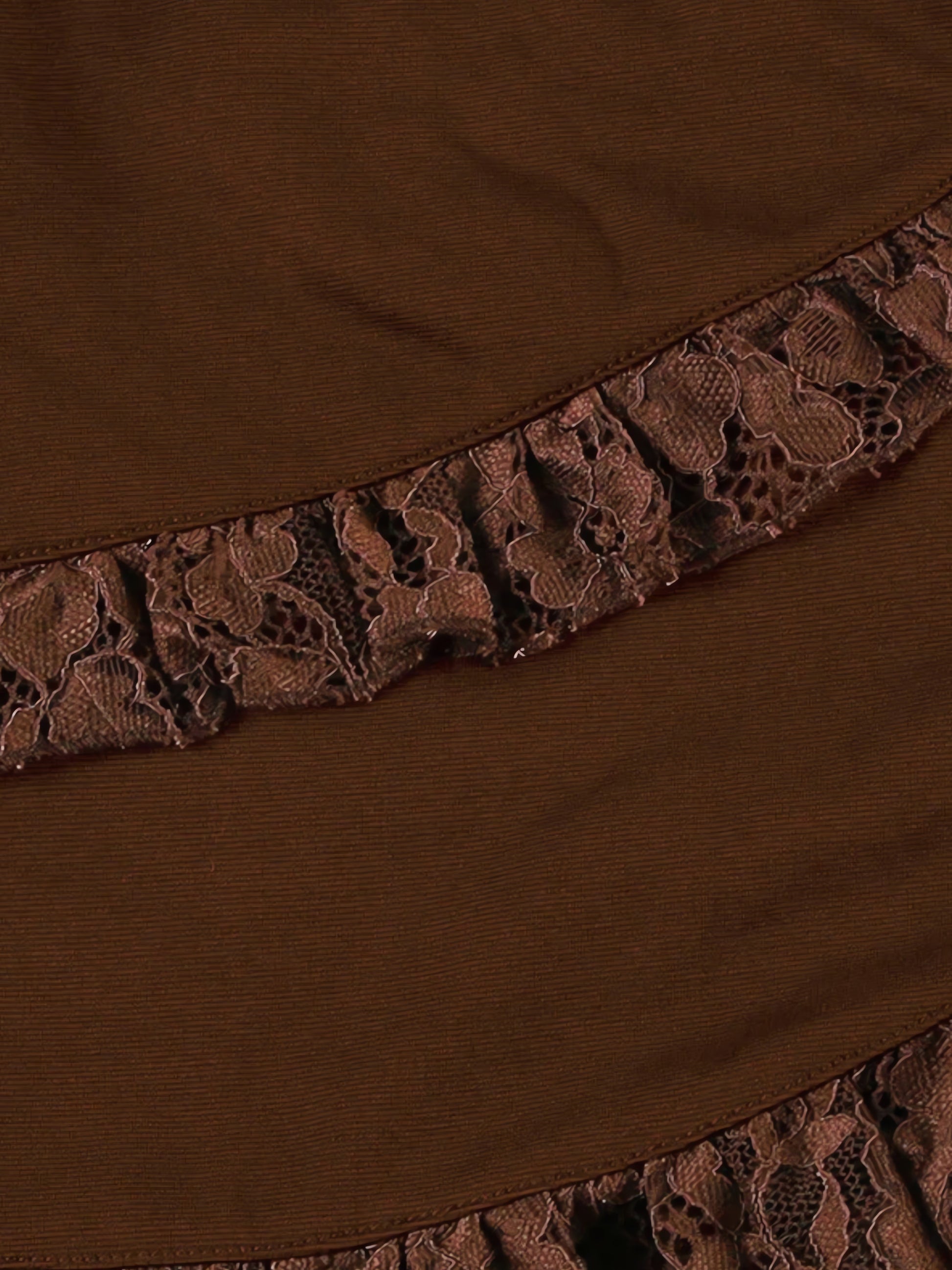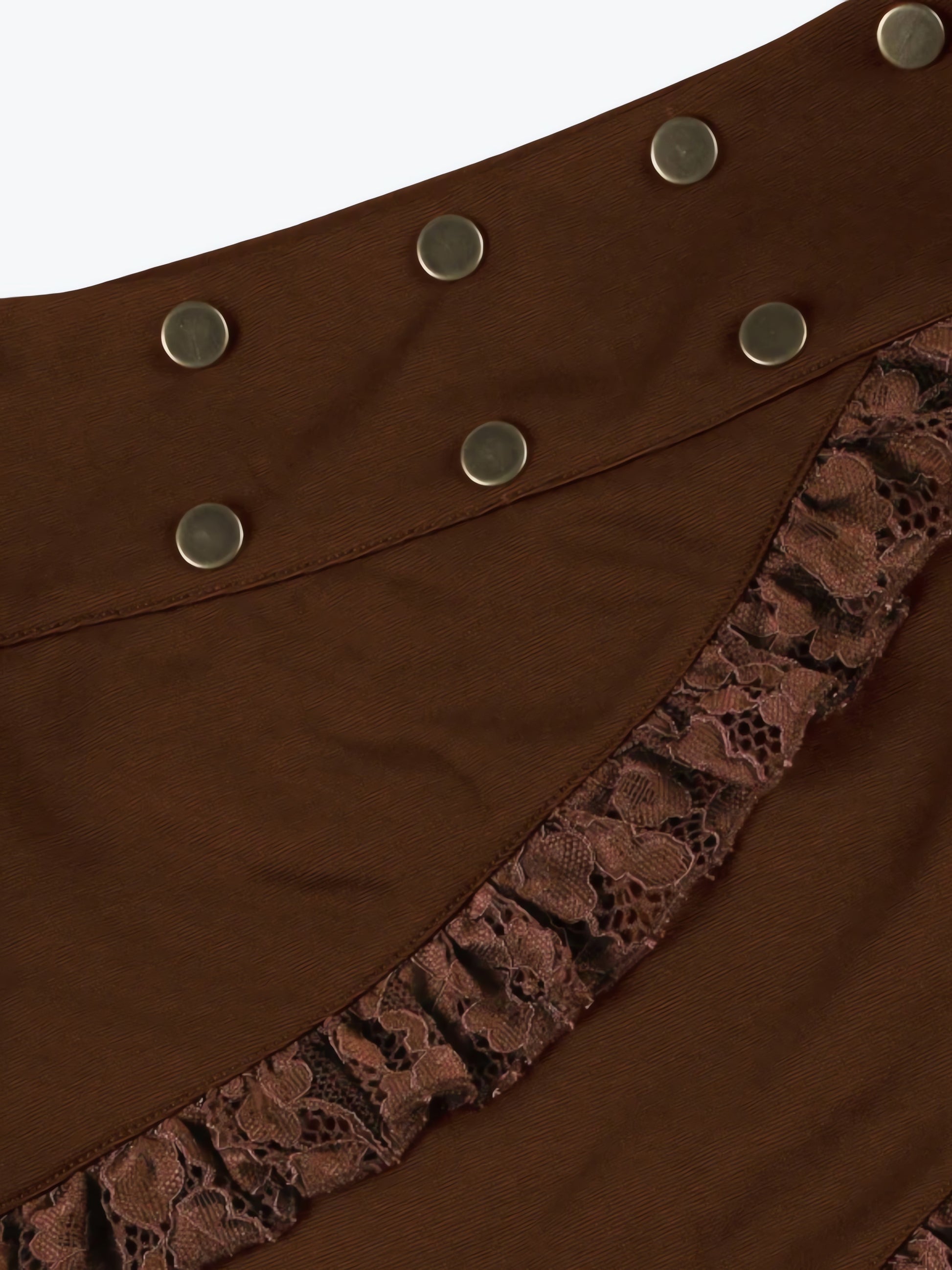 - Functional Details: Two pockets adorned with brown lace trim offer practical storage options. These details enhance the skirt's aesthetic appeal while providing functionality.