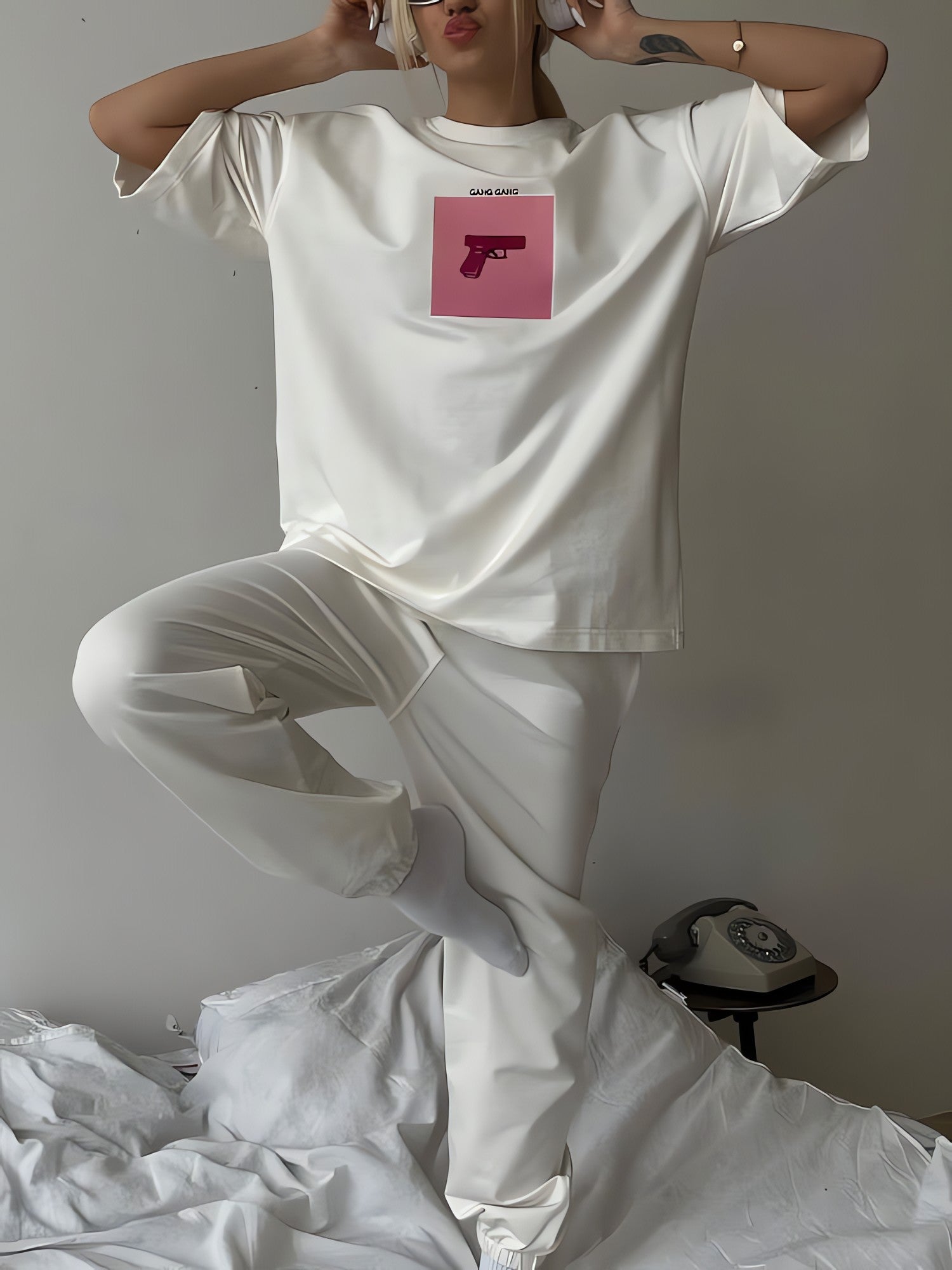Featuring the vibrant and edgy 'Girl Gang' Tee, this statement piece is a must-have for any fashion-conscious individual. The white tee, adorned with a single pink square, makes a bold statement while still maintaining a subtle, understated aesthetic. It pairs perfectly with white pants or denim jeans, and the large graphic on the front adds an extra touch of flair to your outfit.