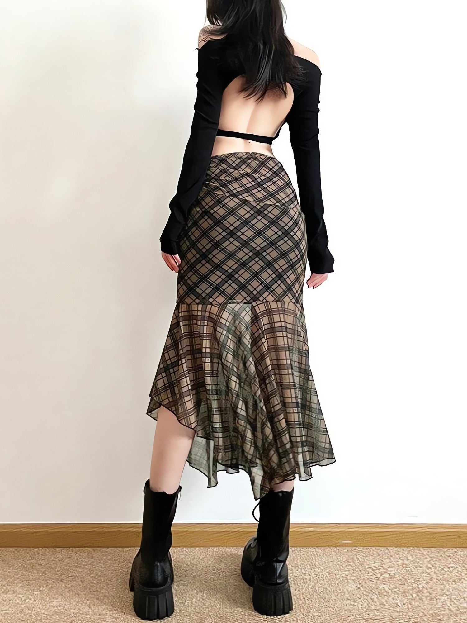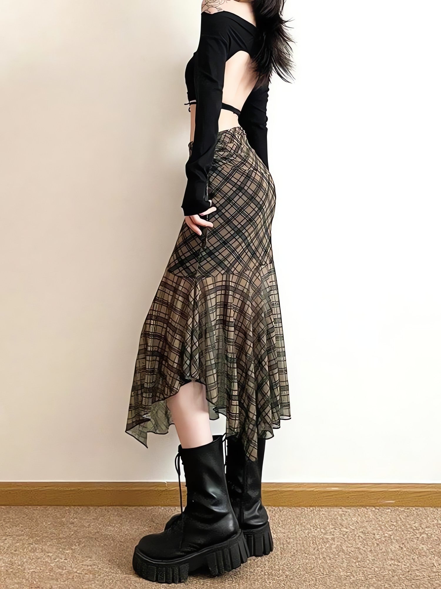 Step into a world of effortless chic with our Grunge Plaid Mesh Midi Skirt. This versatile skirt is designed to add an edgy touch to any outfit.