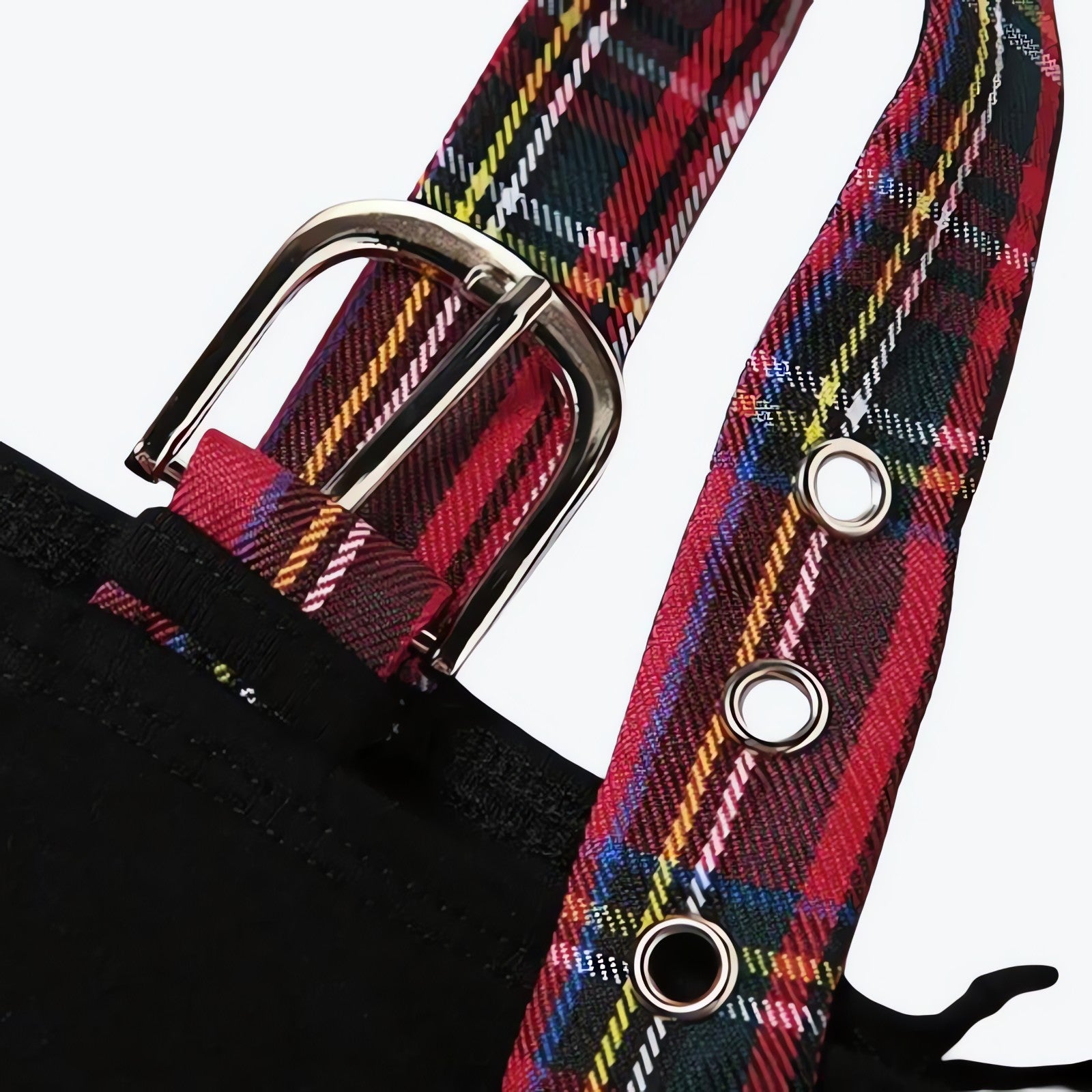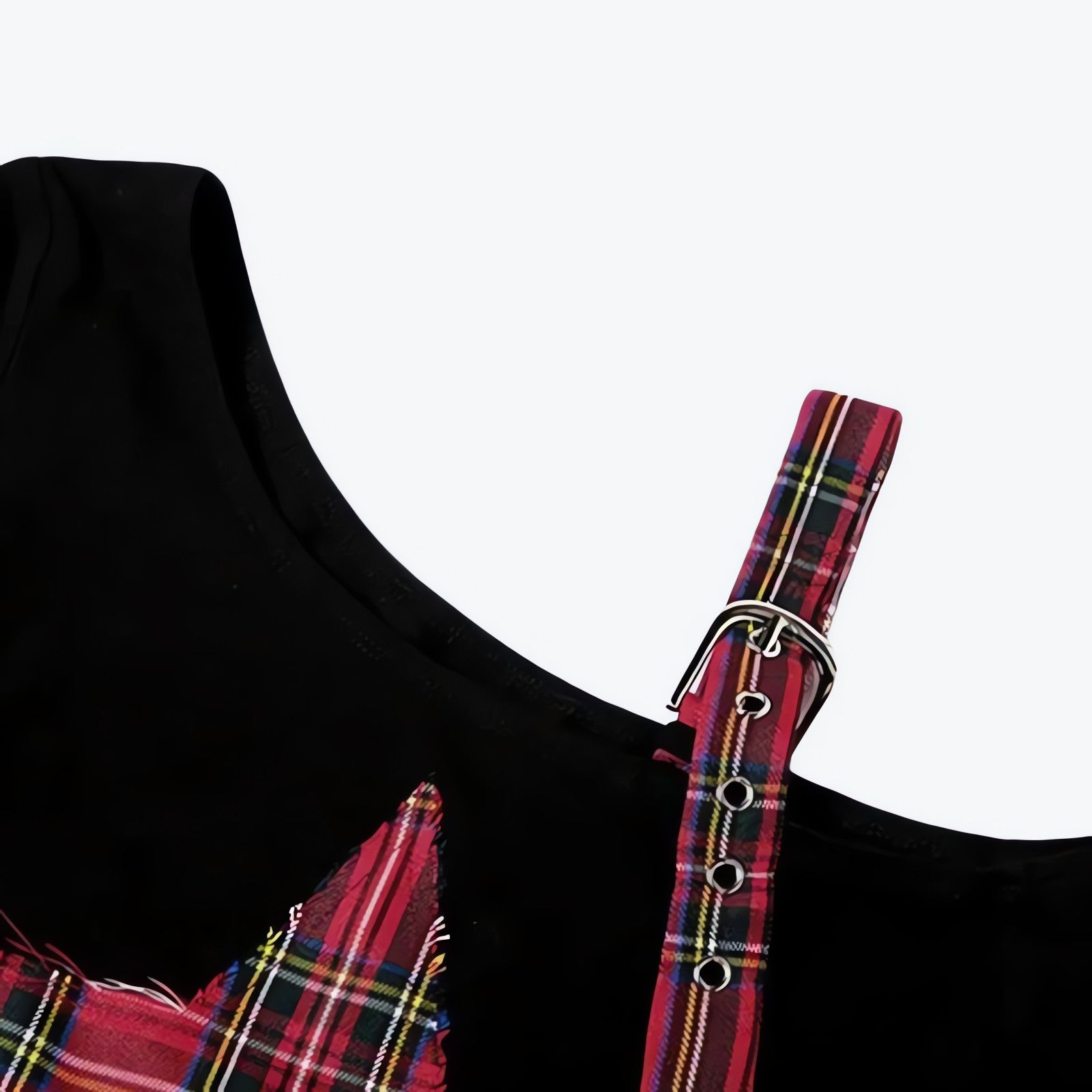 - Featuring a flannel design in vibrant red and black, this top is perfect for those who love a grunge aesthetic.