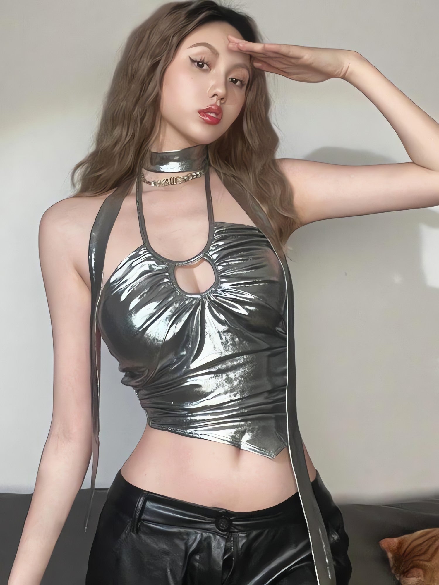 Whether you're looking to make a statement or simply want a reliable staple in your wardrobe, the Metallic Halter Neck Top is sure to become a favorite in no time.