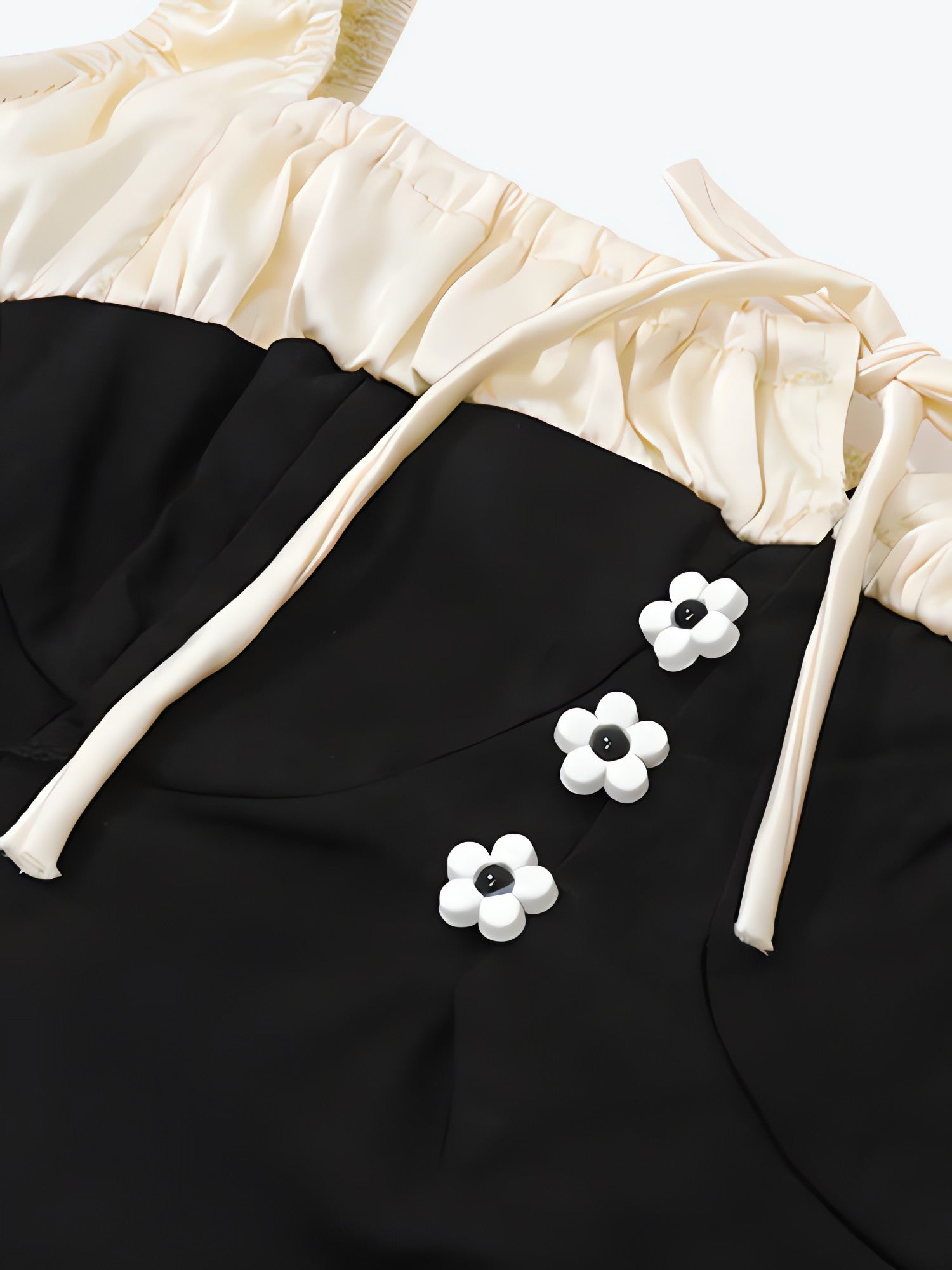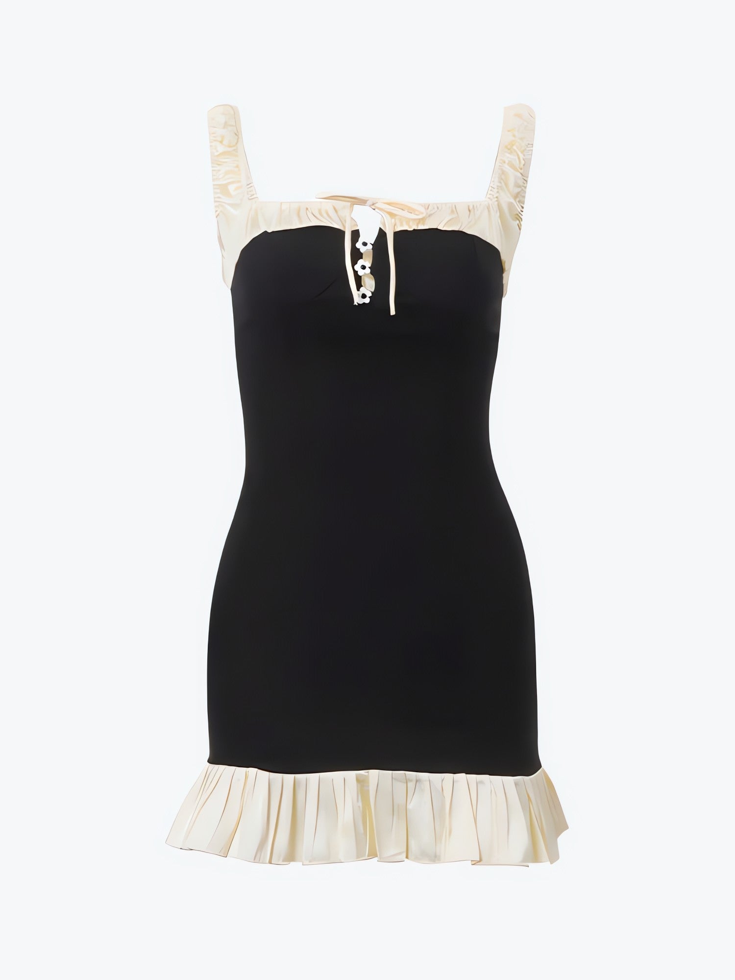 Introducing our Pleated Hem Mini Dress, a timeless piece that exudes elegance and style. Crafted from a luxurious black fabric with beige trim, this dress features a classic pleated hem design that adds an air of sophistication to any ensemble.