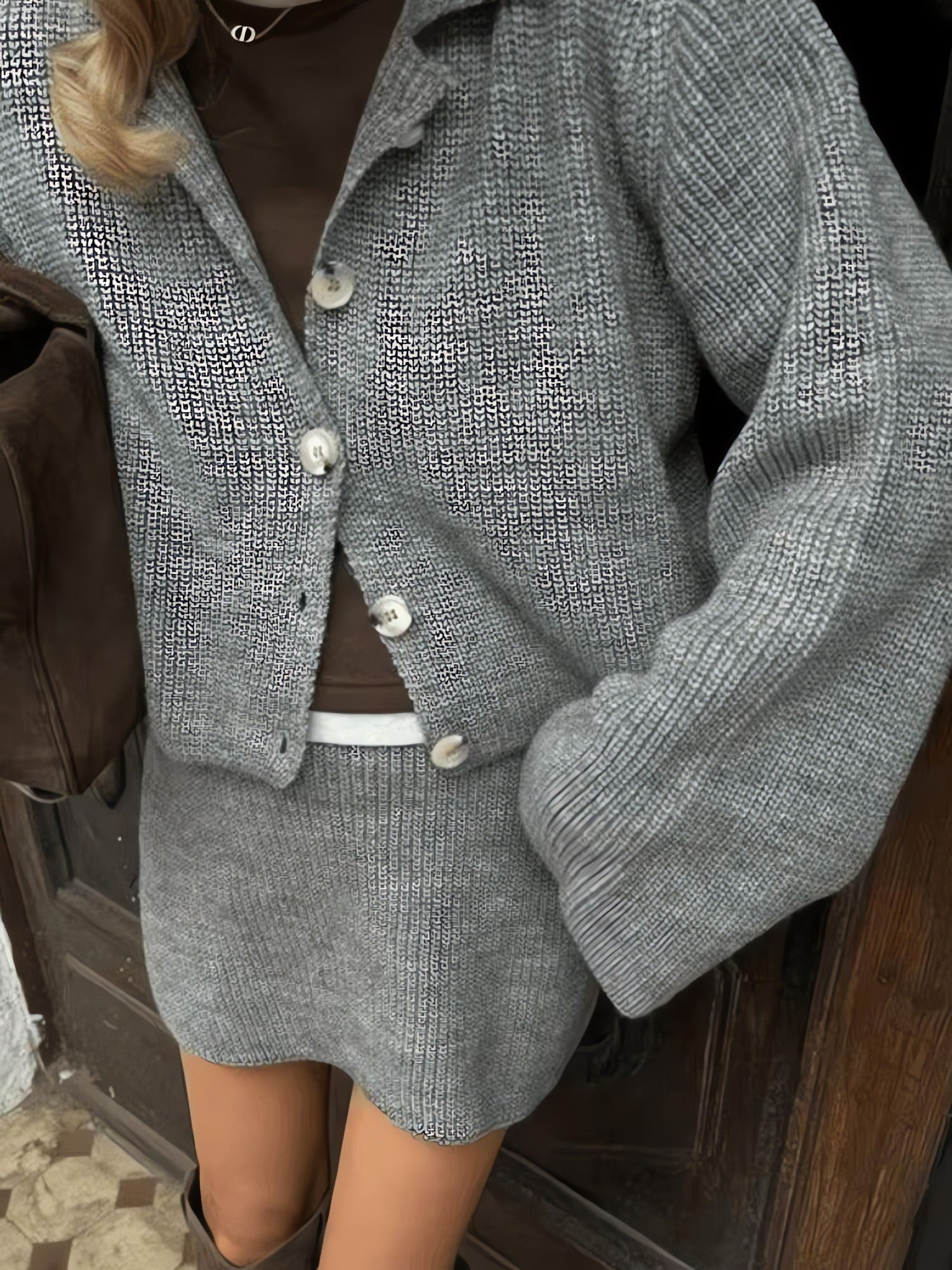 The Preppy Knitted Cardigan & Mini Skirt Two Piece Set is a perfect blend of comfort and style. This outfit features: