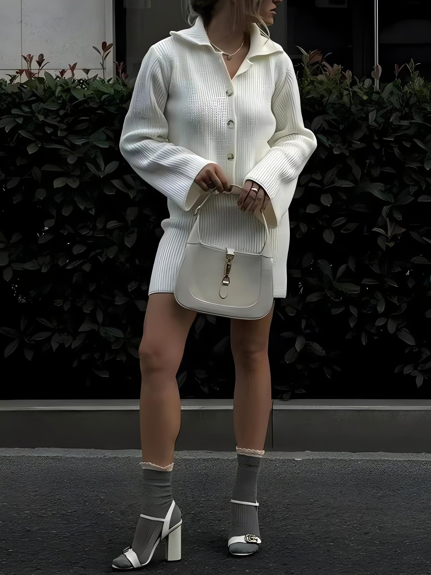 - A cozy knitted cardigan, providing warmth and a touch of sophistication.
