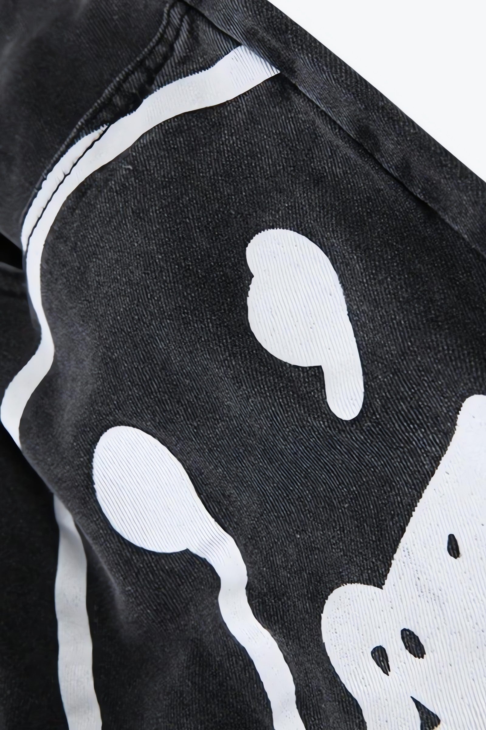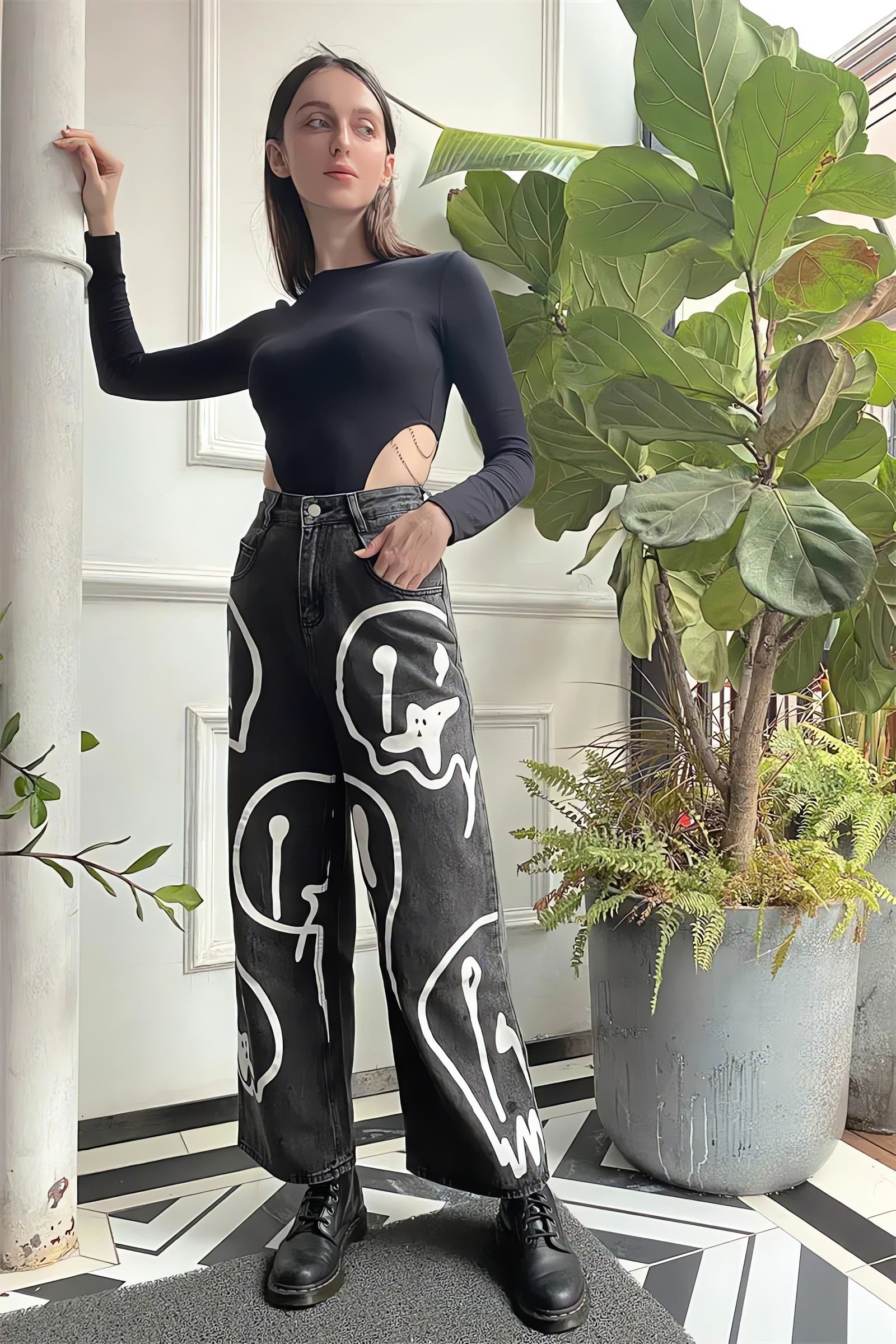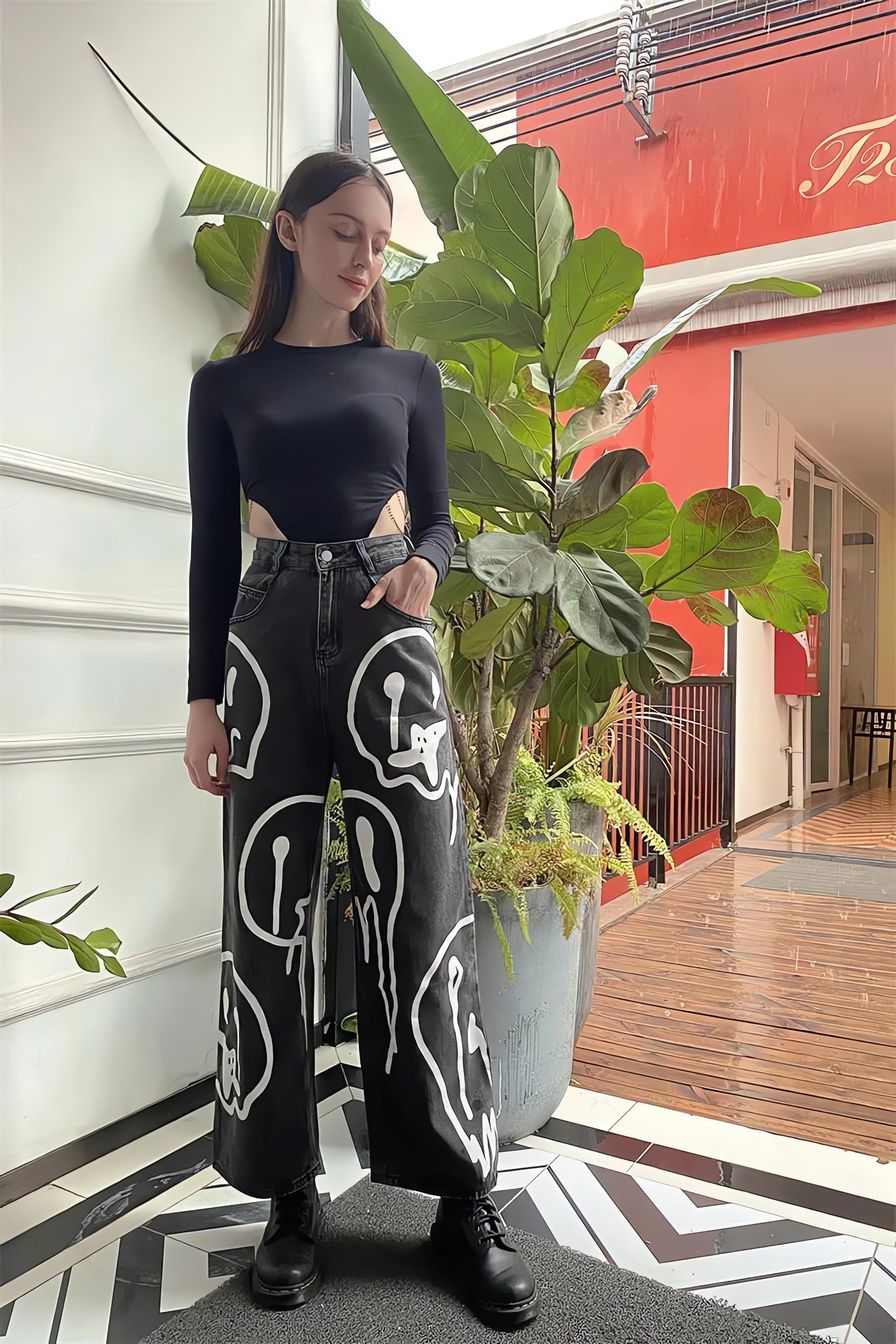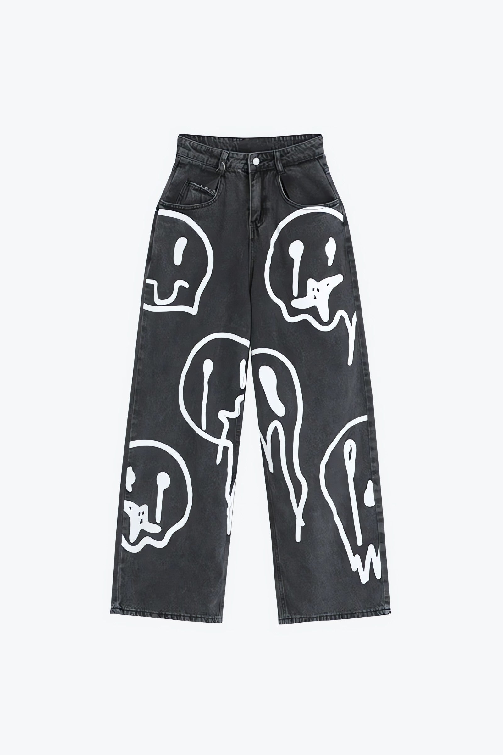 Experience the ultimate fusion of comfort and style with our 'Smiley Jeans'. These jeans are designed to brighten up any outfit, with their playful black smiley face pattern that stands out against the classic blue denim. Here's what you can expect: